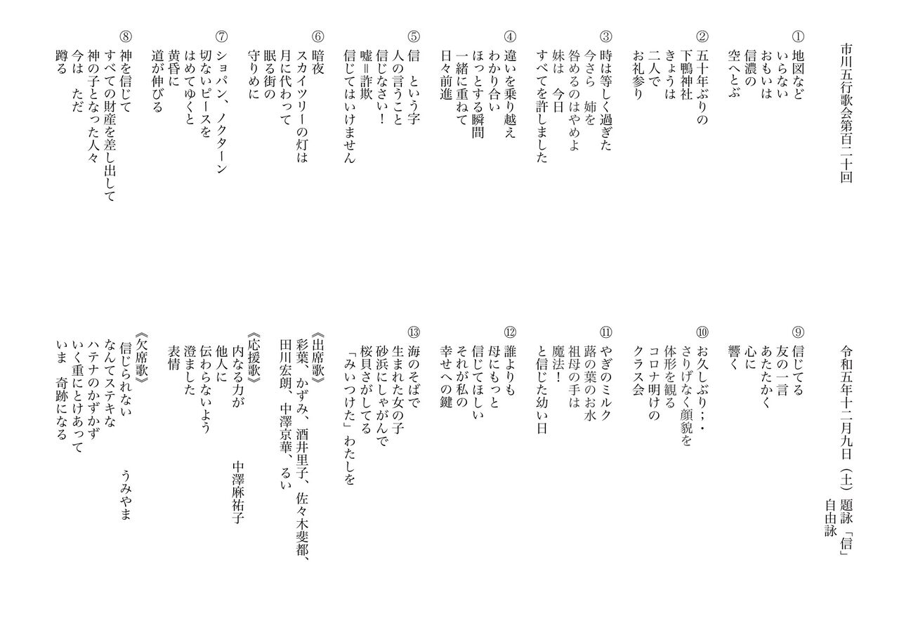 2023年12月10日 第120回「市川五行歌会」二席 違いを乗り越えわかり合いほっとする瞬間一緒に重ねて日々前進※「五行歌の会」http://5gyohka.com※「市川五行歌会」ブログ https://ichikawa-5gyohka.hatenablog.com※Endless Letterhttps://kyoka-nakazawa.blogspot.com カテゴリ五行歌(Gogyohka)https://ameblo.jp/endlessletter-kyoka/theme-10109591867.html < 前の記事次の記事 >